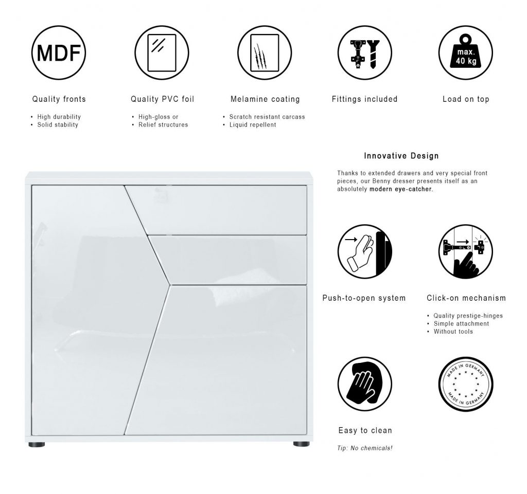 Die Kommode besteht aus hochwertigem Material und hat ein exklusives Design, das sie von anderen Möbelstücken abhebt. Die schrägen Fronttüren und Schubladen sind mit Gleitschienen ausgestattet, um das Öffnen und Schließen zu erleichtern.